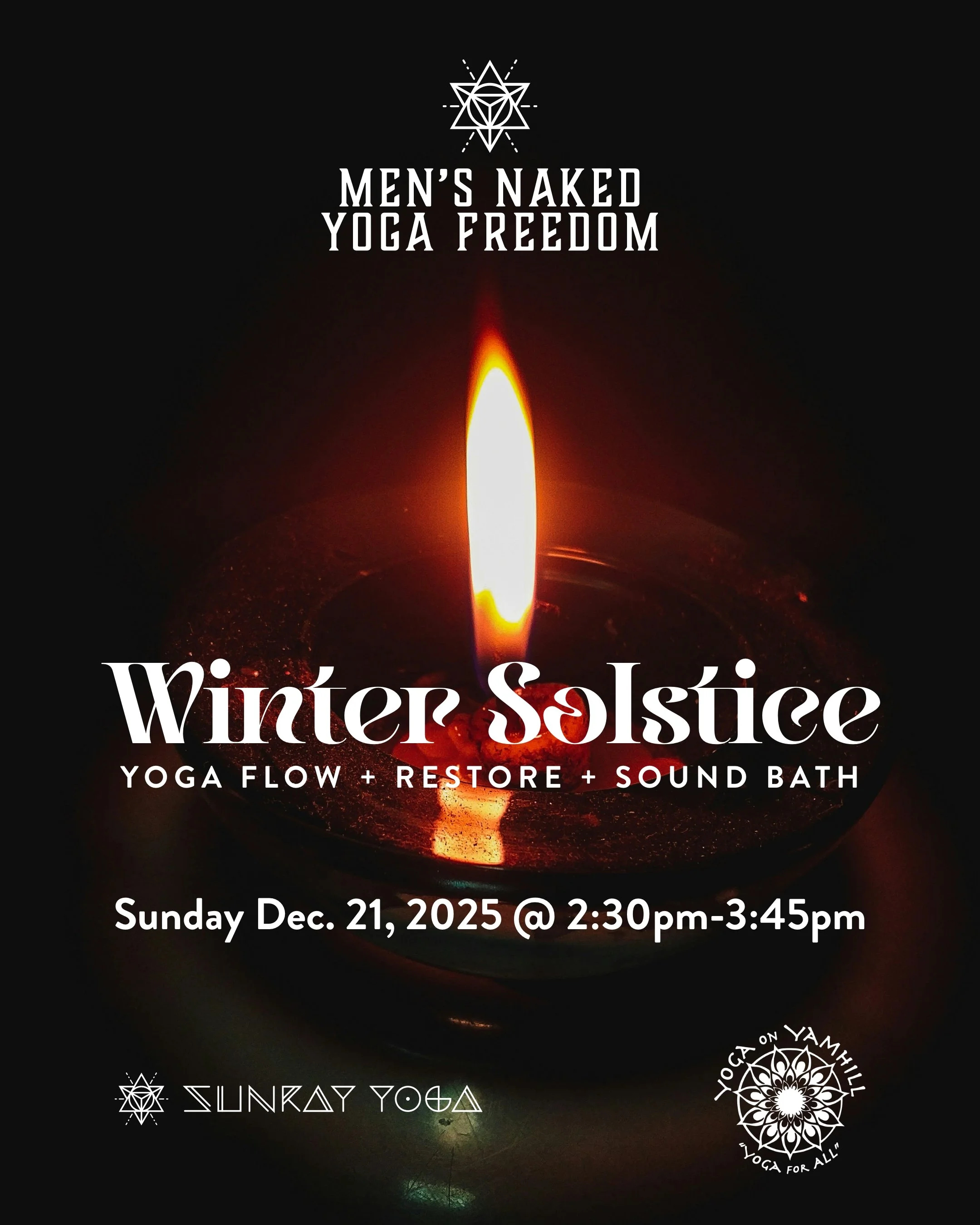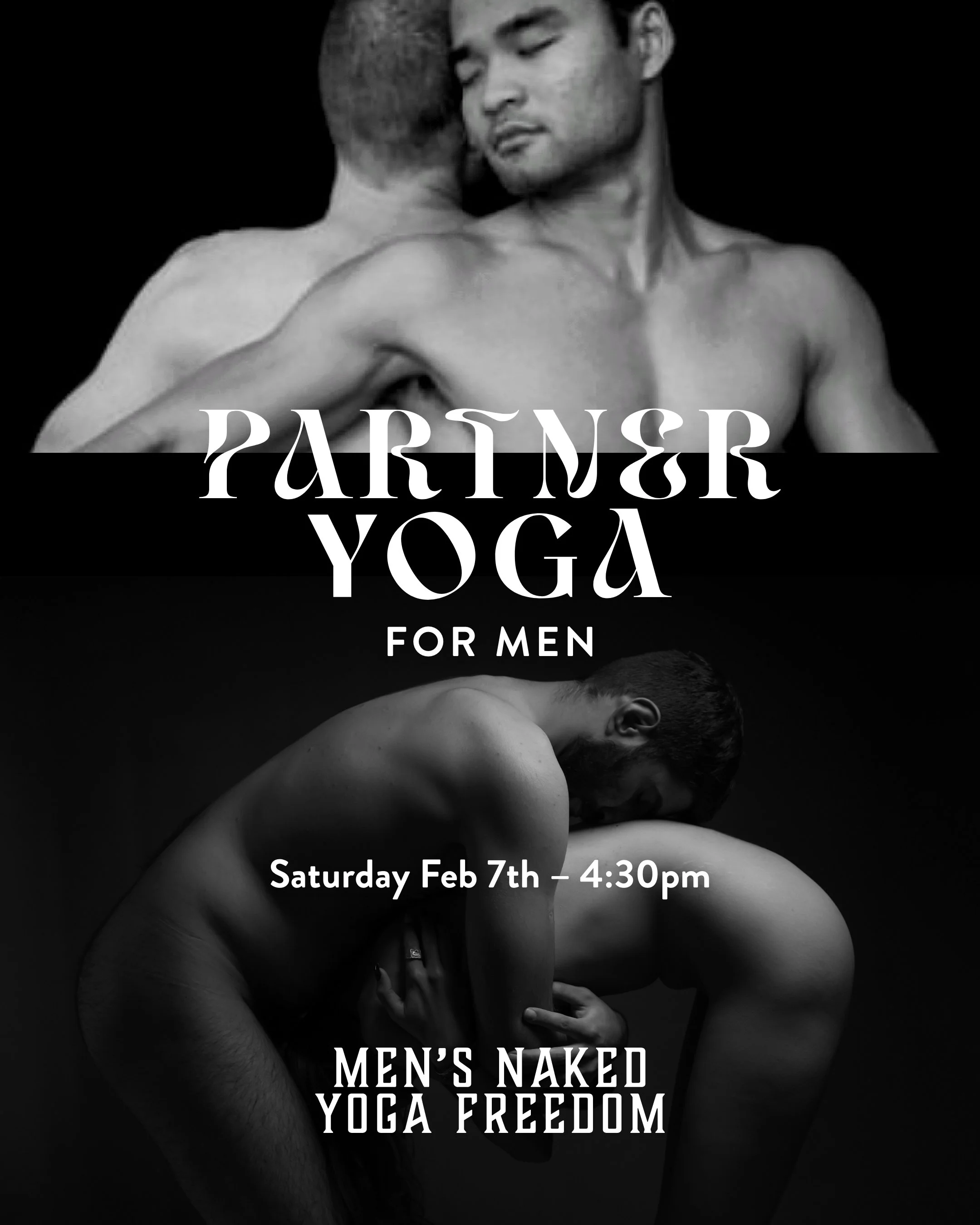 Men's Naked Yoga Freedom presents a workshop where we will explore partner yoga poses. All levels are welcome, no need to bring a partner, we will partner up in class. Please bring a yoga mat, towel, and a water bottle. 4:30-6pm (doors open at 4pm) 90 minutes..